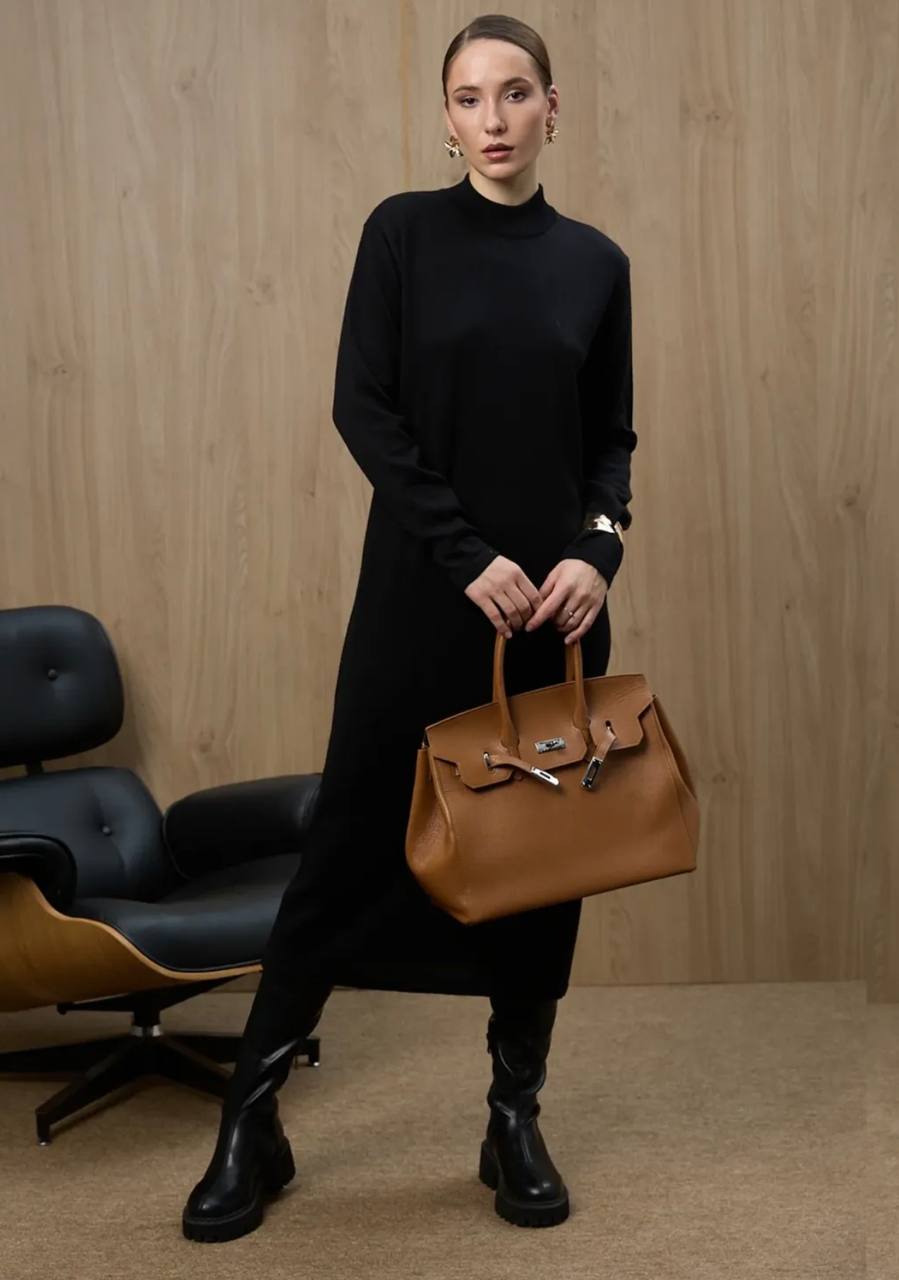 Трикотажное женское платье прямого силуэта с высоким воротником. Минималистичный крой. Длина миди. Цвет - черный. Рост 164 и 170.