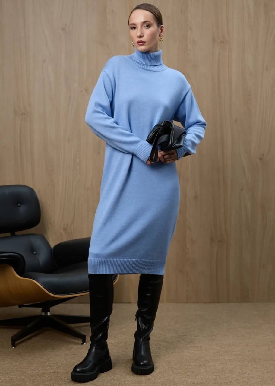 Трикотажное женское платье свободного силуэта с высоким воротником-стойкой. Длина миди. Цвет – голубой. Рост 164 и 170.